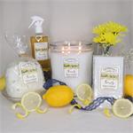 Lemon Zest- tart, crisp citrus with a hint of sweetness Pictured in the bulk wax melts (BWM), room spray (RS), heritage jar (HJ), and aroma melt wax bar (AM)