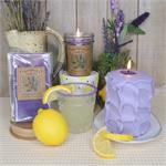 Lavender Lemonade - freshly juiced citrus, sugar, and refreshing lavender Pictured in the aroma melt wax bar (AM), mini mason jar (MM), and medium pillar (MP)